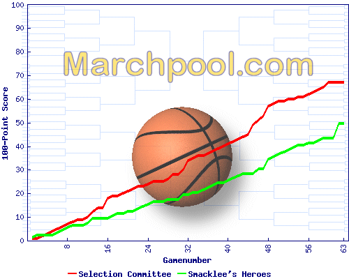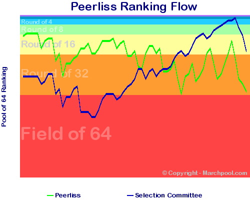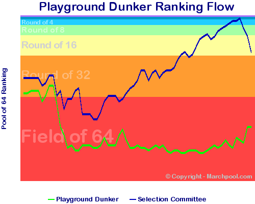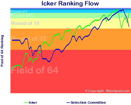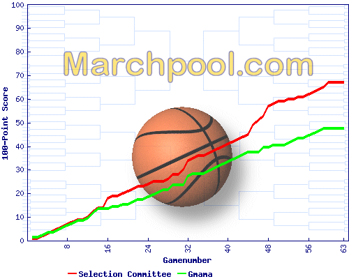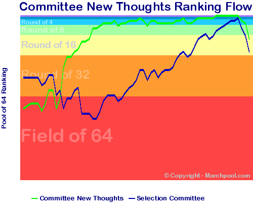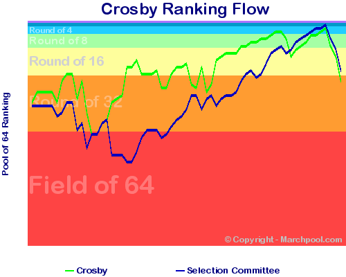 EAST | SOUTH | MIDWEST | WEST | Final 4 | 100 Pt. Score | Seed x Round Pts | Rating | Pred. Winner | ||