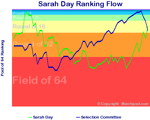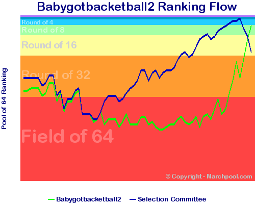 | 140 | Babygotbacketball | S | F | R | 18 | 9 | 19 | 9 | 0 | 55 | 192 of 382 | Field of 64 | ![]() |